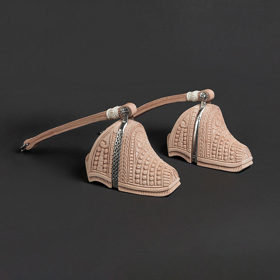 La llanta que refuerza cada estribo se fabrica en acero inoxidable. Carlos la forja y ajusta a mano, moldeándola para que encaje perfectamente. Además, graba detalles en su lateral con cinceles, añadiendo un toque único a cada pieza.